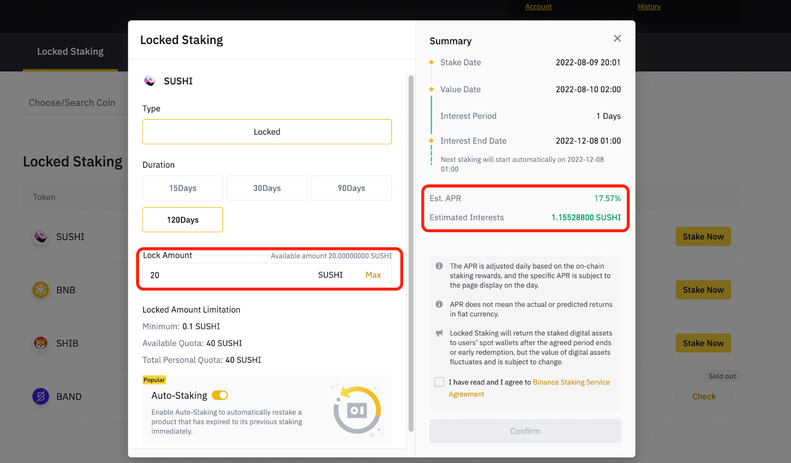 Lưu ý rằng mỗi đồng coin đều có APR (Tỷ lệ phần trăm lợi nhuận hàng năm) khác nhau. Bạn có thể chọn thời gian staking (Ví dụ 30, 60, 90 ngày) và số tiền tối thiểu để staking.