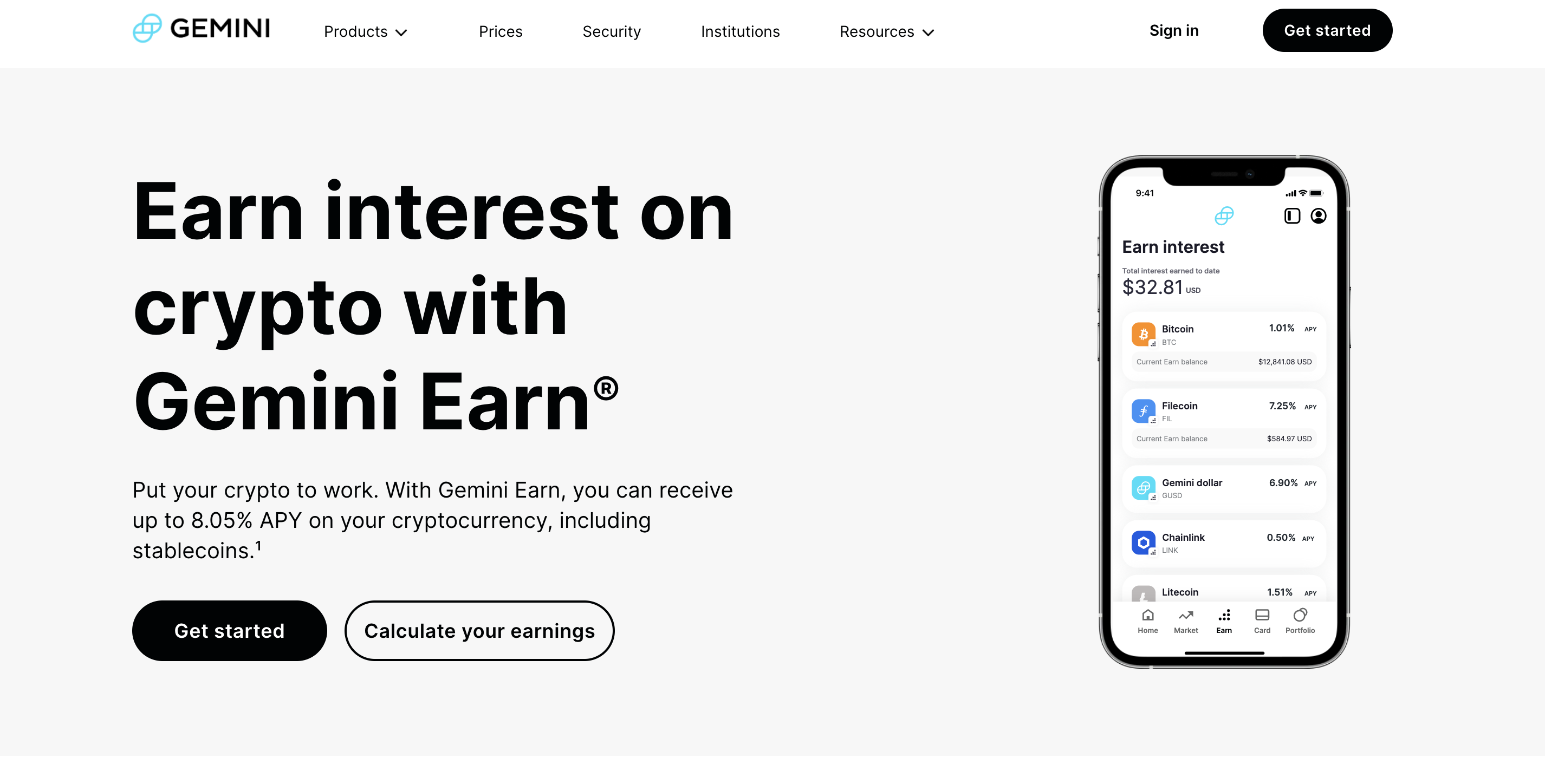 - Lãi suất: Gần đây, Gemini đã khởi chạy chương trình Gemini Earn với mức lãi suất lên đến 8.05% tùy thuộc vào đồng tiền được gửi. Với BTC, nó cung cấp lợi nhuận khoảng 2%.
