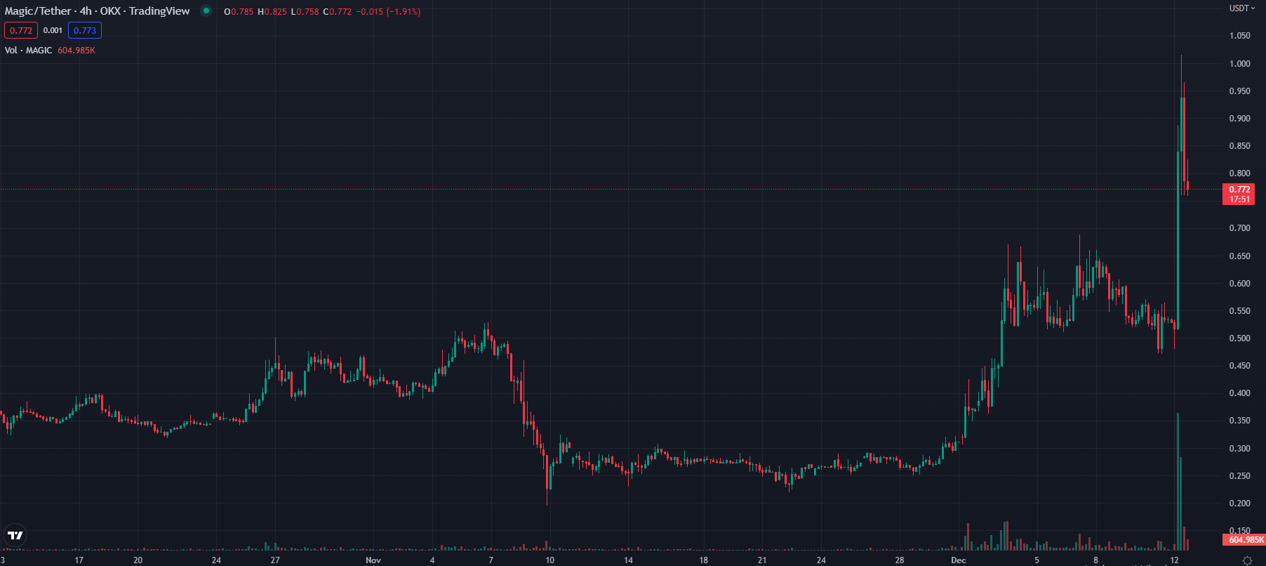 Tại thời điểm BeInCrypto thực hiện bài viết này, giá MAGIC hiện đang giao dịch ở mức 0.7853 USD. Vốn hóa thị trường hiện tại của MAGIC là 163 triệu USD. Trong 24 giờ qua, giá MAGIC đã tăng hơn 50% giá trị. Điều này có thể do tin tức MAGIC được niêm yết trên Innovation zone của sàn giao dịch Binance nên đã khiến cộng đồng quan tâm đến vậy.