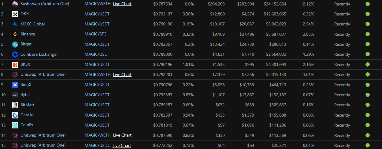 - Sàn giao dịch: Người dùng có thể thực hiện giao dịch MAGIC token trên một số sàn CEX lớn như Binance, OKX, MEXC Global… hoặc một số sàn DEX như Uniswap, SushiSwap…