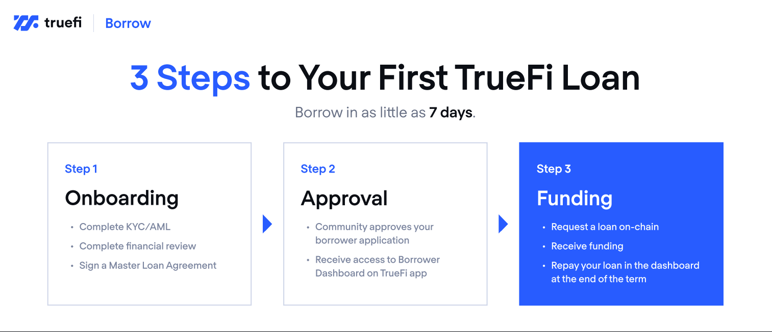 TrueFi là một giao thức cho vay phi tập trung có lãi suất tốt đối với người cho vay. Nó cho phép người đi vay không cần thế chấp. Tất cả các yêu cầu vay trên nền tảng được thẩm định mức độ tín nhiệm từ cộng đồng stake token TRU. Khi hội đồng đồng ý thì yêu cầu vay được phê duyệt. Các khoản vay trên TrueFi thường là stablecoin như USDT, USDC, TUSD.
