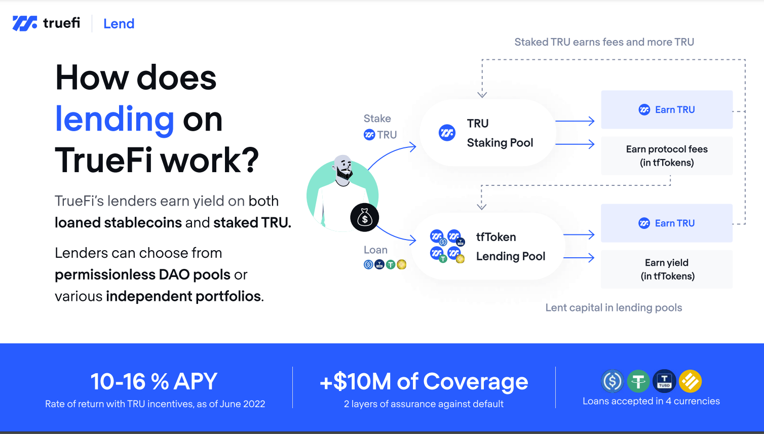 Trên nền tảng TrueFi, người dùng sử dụng tài sản có sẵn để khai thác lợi nhuận được gọi là người cho vay (Lender). Trong đó, lender sẽ kiếm lợi nhuận từ việc stake TrueUSD (TUSD) vào TrueFi pool hoặc farm từ các stablecoin có sẵn. Tài sản cho vay của lender được đảm bảo bởi quỹ SAFU của TrueFi. Thông qua các công cụ quản lý tài sản, lender dễ dàng giám sát việc rút tiền, gửi tiền và phân bổ các danh mục đầu tư. Tuy nhiên, lender sẽ phải chi trả một phần nhỏ cho cơ cấu phí trên nền tảng.