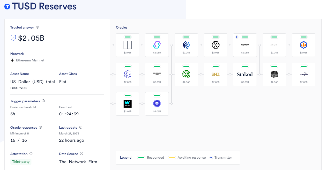 Dự án stablecoin này sử dụng hệ thống PoR do Chainlink (LINK) cung cấp. Nó là một mạng lưới khách quan đến từ 16 nhà cung cấp dịch vụ oracle khác nhau. Dữ liệu gần nhất tại thời điểm BeInCrypto viết bài cho thấy TUSD reserves ở mức 2.05 tỷ USD. Với tổng cung TUSD đang lưu hành ngoài thị trường (2.04 tỷ USD) thì dường như TrueUSD đang lưu trữ nhiều hơn so với lượng TUSD token họ phát hành ra.