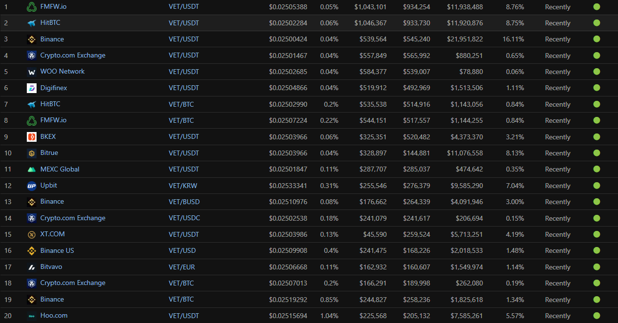 - Sàn giao dịch: Tại thời điểm BeInCrypto viết bài này, người dùng có thể tìm kiếm và sở hữu các token VET tại một số sàn CEX lớn trên thế giới như Binance, Huobi Global hay CoinEX…