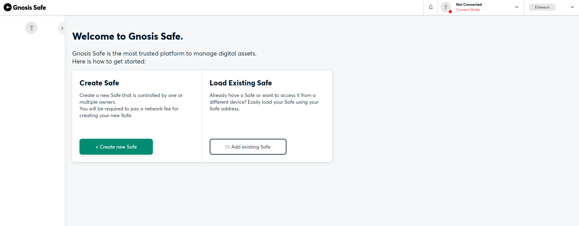 Đầu tiên, hãy truy cập https://gnosis-safe.io/app/. Để bắt đầu tạo một Safe, trước tiên bạn phải kết nối ví của người ký. Safe hỗ trợ nhiều loại ví người ký như MetaMask, Trezor. Ledger hoặc thông qua WalletConnect.