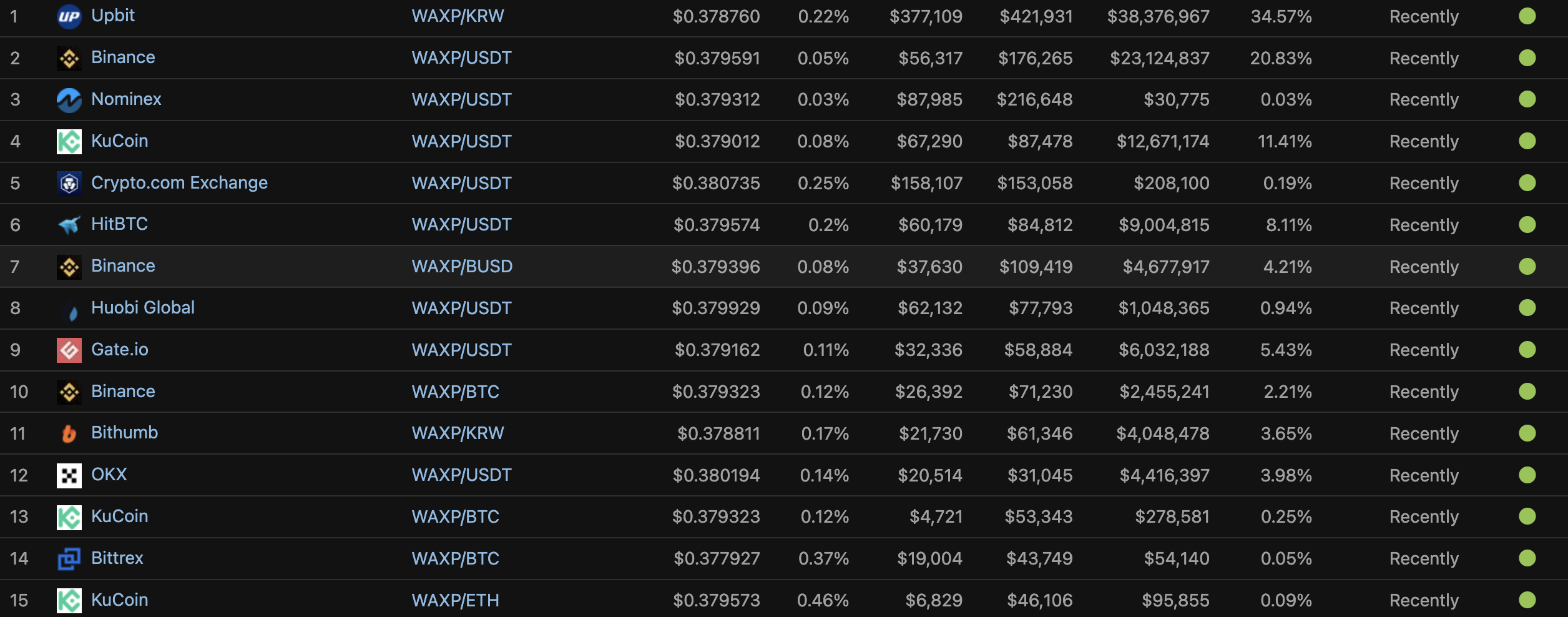 - Sàn giao dịch: Token WAX đã được list trên các sàn CEX như Huobi Global, Binance,… hay sàn DEX Uniswap v2.