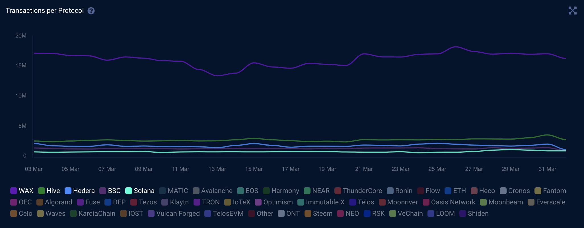 Và tính đến thời điểm hiện tại, WAX blockchain đang có số lượng giao dịch lớn nhất thị trường mà chúng ta đang nói đến ở trên.