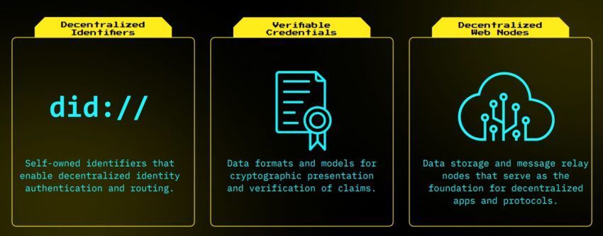 Web5 cũng hoạt động bằng cách sử dụng DID (Nhận dạng phi tập trung) và thông tin xác thực có thể xác minh. Đây là thành phần cơ bản mà bạn có thể sử dụng để tạo danh tính. Điều này có nghĩa là người dùng có thể tự nhận dạng mà không cần phụ thuộc vào bất kỳ bên nào. Nói cách khác, DID chỉ là một thành phần “chạm” vào blockchain công khai. Nó không cần phải được lưu trữ trên chính blockchain.