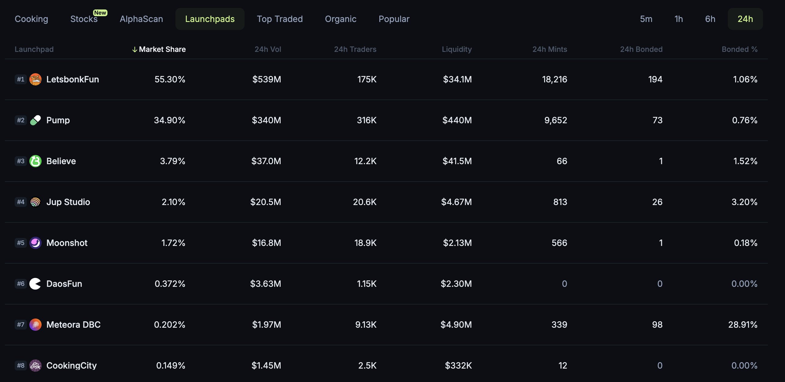 Với hơn 55.30% thị phần và khối lượng giao dịch 24 giờ đạt 539 triệu USD, LetsBonk đang củng cố vị thế của mình trong thị trường tiền điện tử sôi động. Sự đột phá này không chỉ là một chiến thắng về số liệu mà còn phản ánh chiến lược phát triển của nền tảng ra mắt meme coin trong hệ sinh thái Solana.