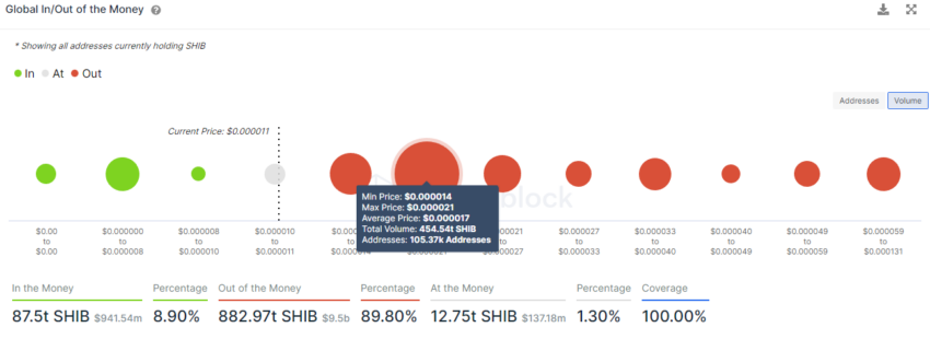Chỉ báo Global In and Out of Money đã cho thấy rào cản nguồn cung quan trọng nhất tiếp theo đối với SHIB nằm ở mức 0.000017 USD, nơi 105,000 địa chỉ nắm giữ hơn 450 nghìn tỷ SHIB. Nếu phe bò cố gắng đẩy giá vượt qua rào cản nguồn cung nói trên ở mức 0.000017 USD thì có thể có nhiều khả năng tăng giá hơn.