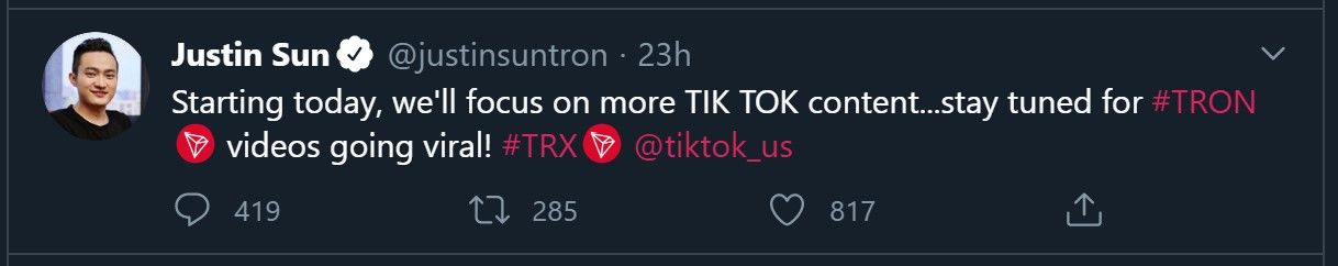 Sau khi Dogecoin (DOGE) bật tăng mạnh và được xếp vào Top những đồng tiền điện tử có khối lượng giao dịch lớn trong ngày trên Coinmarketcap. Lập tức Justin Sun – Founder của đồng tiền điện tử TRON (TRX) – đã tweet về kế hoạch tập trung phát triển nội dung trên nền tảng mạng xã hội này.