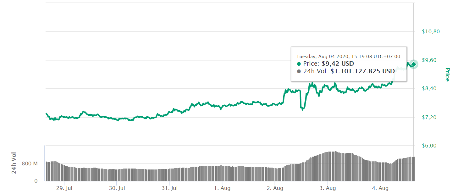 Lần đầu tiên trong lịch sử nhiều năm của mình, giá của LINK đã vượt qua ngưỡng 9,00 USD vào hôm thứ 2. Hiện tại, giá của đồng altcoin này đang đứng ở mức 9,43 USD, theo CoinMarketCap.