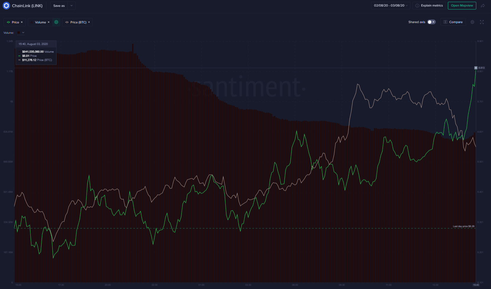 “LINK đang cho thấy dấu hiệu tích cực, trong khi BTC và hầu hết thị trường đang trượt nhẹ trở lại đôi chút. Một điều cần chú ý là khối lượng giao dịch và xã hội trong mối liên hệ với xu hướng giá của nó. Một sự gia tăng dường như đang bắt đầu, cho thấy mối tương quan với sự tăng giá gần đây.”