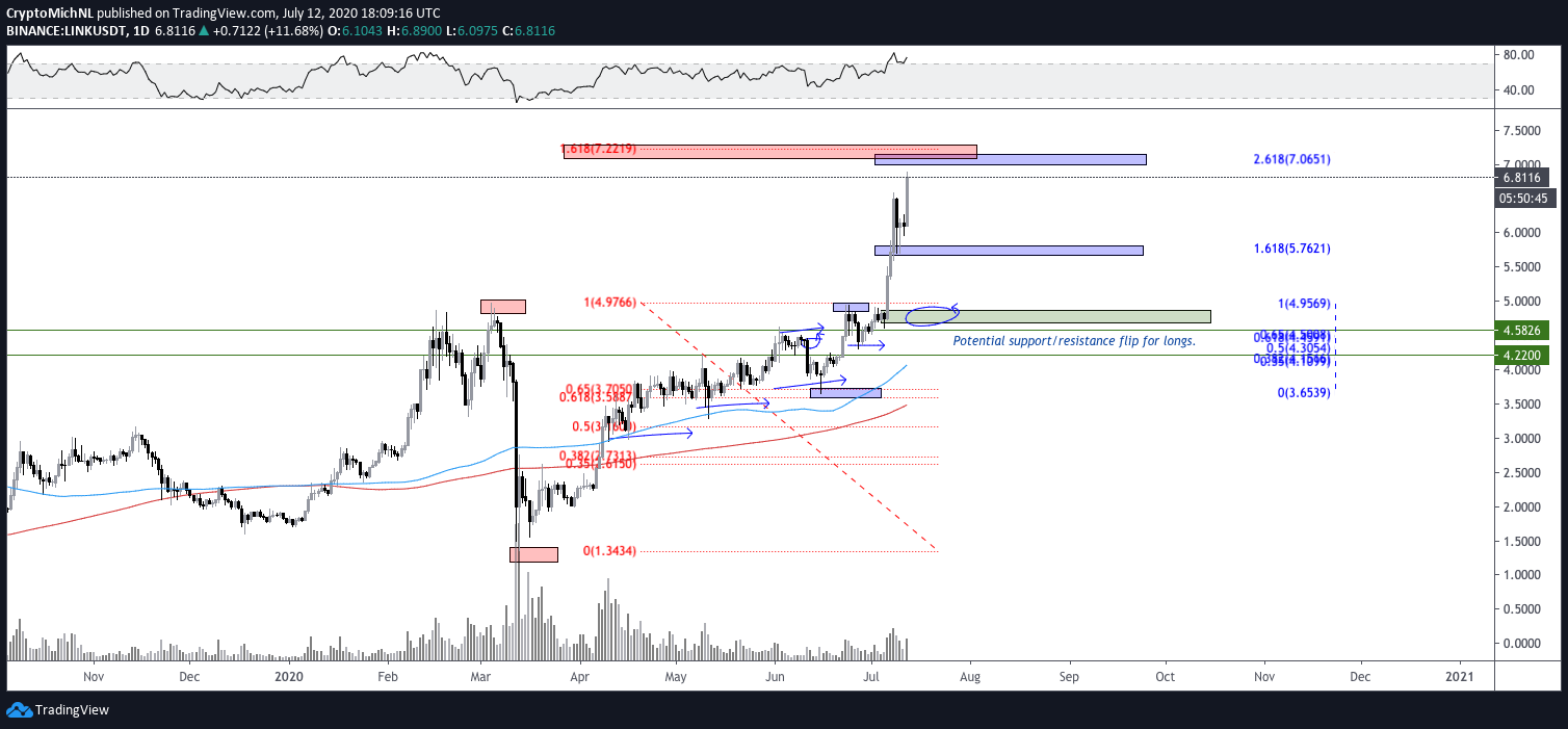 Van de Poppe cho rằng 7,22 USD là mức thoái lui 1.618 Fibonacci của đỉnh cao mọi thời gian trước đó, được thiết lập vào tháng 6. Ngưỡng giá 7,06 USD cũng là mức thoái lui 2.618 Fibonacci từ đỉnh cao tháng tư tại 3,65 USD.