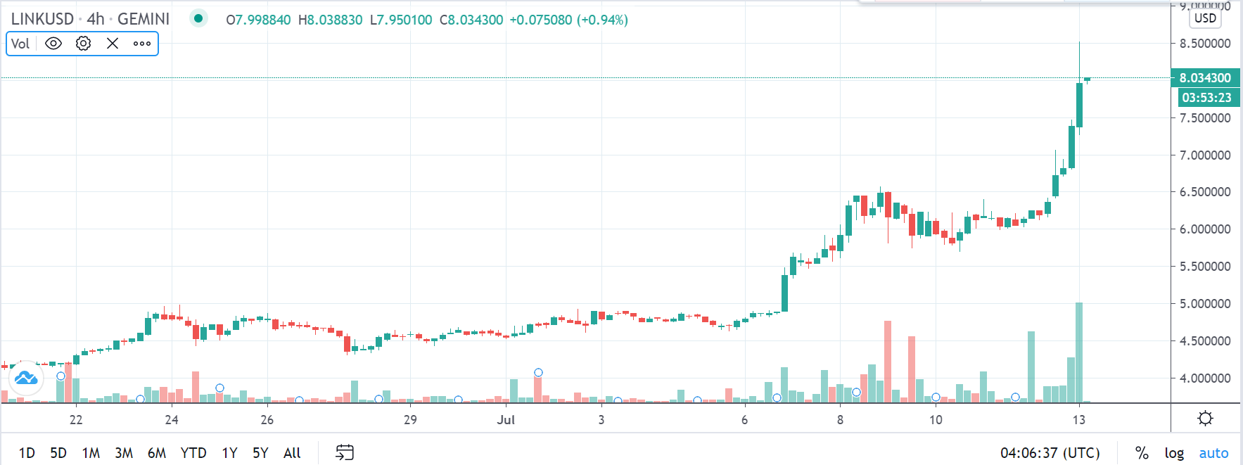 Chainlink (LINK) vẫn đang tiếp tục xu hướng tăng trưởng mạnh mẽ của mình. Đồng altcoin này vừa mới vượt qua cột mốc 8 USD lần đầu tiên trong sáng nay (13/7), cao gấp đôi đỉnh cao năm 2018 của mình.