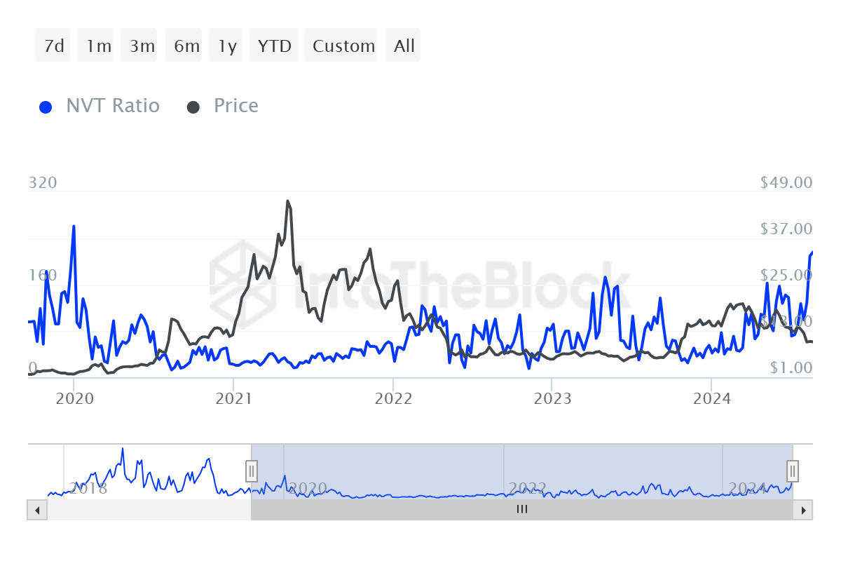 Giá Chainlink có thể gặp khó khăn khi nỗ lực lấy lại những tổn thất gần đây. Tỷ lệ Network Value to Transaction (NVT) của Chainlink đã đạt mức cao nhất trong bốn năm và tám tháng, dấu hiệu cho thấy xu hướng giảm giá tiềm năng cho tài sản tiền mã hóa này trong tương lai. Tỷ lệ NVT cao mang ý nghĩa rằng giá trị của mạng lưới có thể đã được mở rộng quá mức so với khối lượng giao dịch. Điều này thường là dấu hiệu của một đợt điều chỉnh giá.