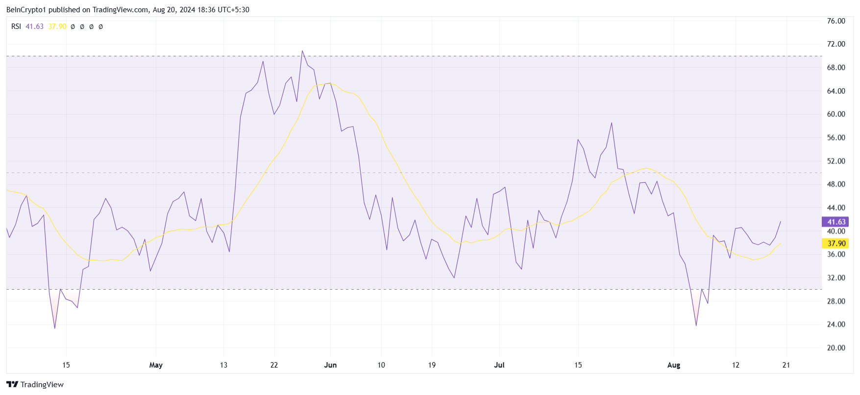 SponsoredBên cạnh tỷ lệ NVT, chỉ số sức mạnh tương đối (RSI) của Chainlink cũng ở trong vùng tiêu cực. RSI là một chỉ báo động lượng quan trọng, và giá trị hiện tại của nó cho thấy LINK đang chứng kiến động lượng giảm giá.