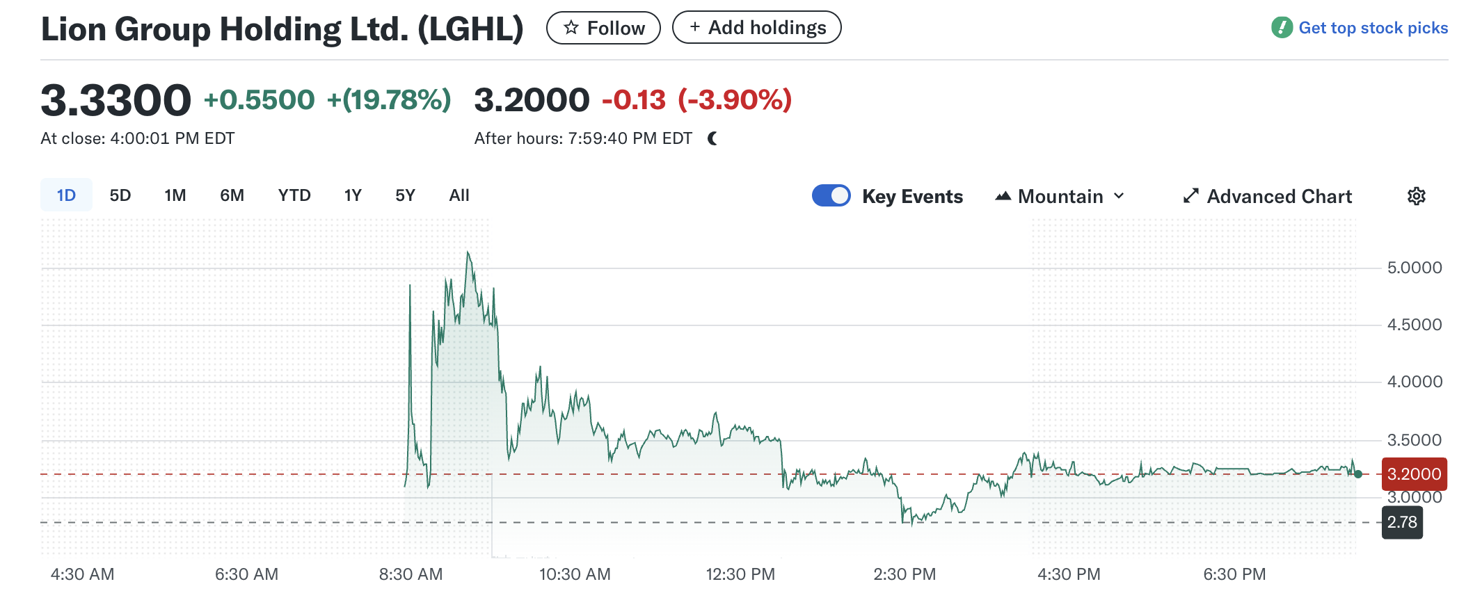Dữ liệu từ Yahoo Finance cho thấy giá đã tăng 19.78%, đóng cửa ở mức 3.33 USD vào ngày 18/06. Tuy nhiên, LGHL đã giảm 3.9% xuống còn 3.20 USD trong giao dịch sau giờ.