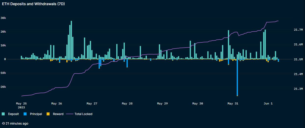 Theo dữ liệu của Nansen, 21.7 triệu ETH hiện đang được staking. Tuy nhiên, Beaconcha.in báo cáo con số thấp hơn nhiều là 19.1 triệu.