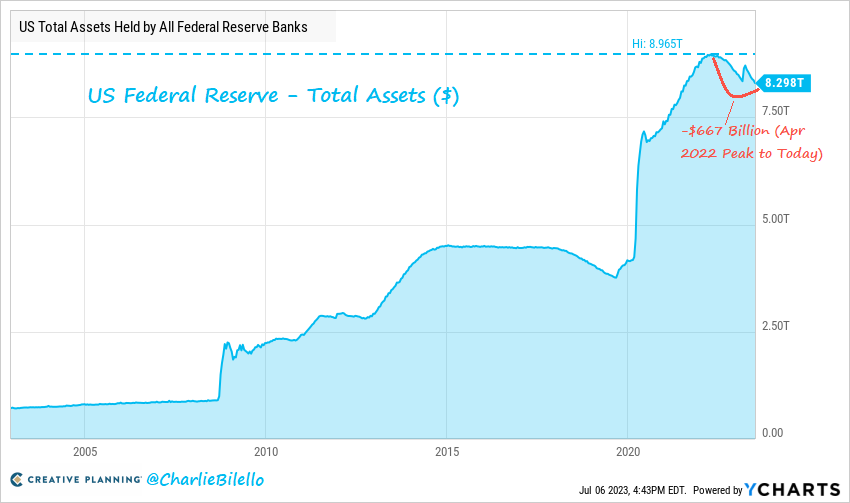 Bảng cân đối kế toán của Fed đã chạm mức thấp nhất kể từ tháng 8 năm 2021 trong tuần này, giảm 667 tỷ USD so với mức đỉnh vào tháng 4 năm 2022.