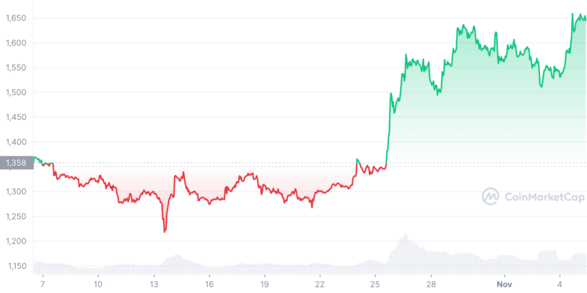 Có vẻ như với bất kỳ lời chỉ trích nào về lộ trình của mạng Ethereum cũng đều không ảnh hưởng tiêu cực đến giá ETH. Theo đó, giá ETH tăng vượt trội hơn so với BTC trong 24 giờ qua và 30 ngày qua. Theo dữ liệu được BeInCrypto ghi nhận từ CoinMarketCap, giá Ethereum đã tăng 4.8% trong 24 giờ qua. Và tăng 22.3% trong 30 ngày qua. Nó hiện đang giao dịch ở mức 1.652 USD tính đến thời điểm BeInCrypto viết bài này. Trong khi đó, Bitcoin chỉ tăng 3.9% trong 24 giờ và 6.1% trong 30 ngày.