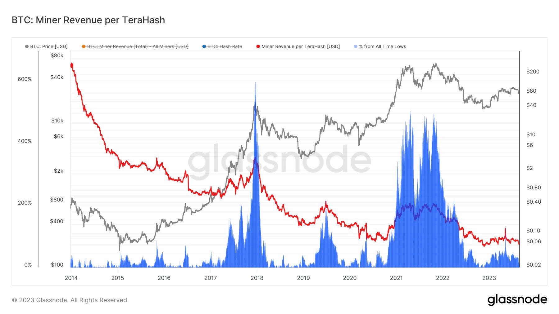 Doanh thu của của Miner tính trên mỗi TeraHash đang giảm về mức thấp lịch sử. Dữ liệu Miner Revenue per TeraHash từ glassnode cho thấy vài điều đang lưu ý như sau: