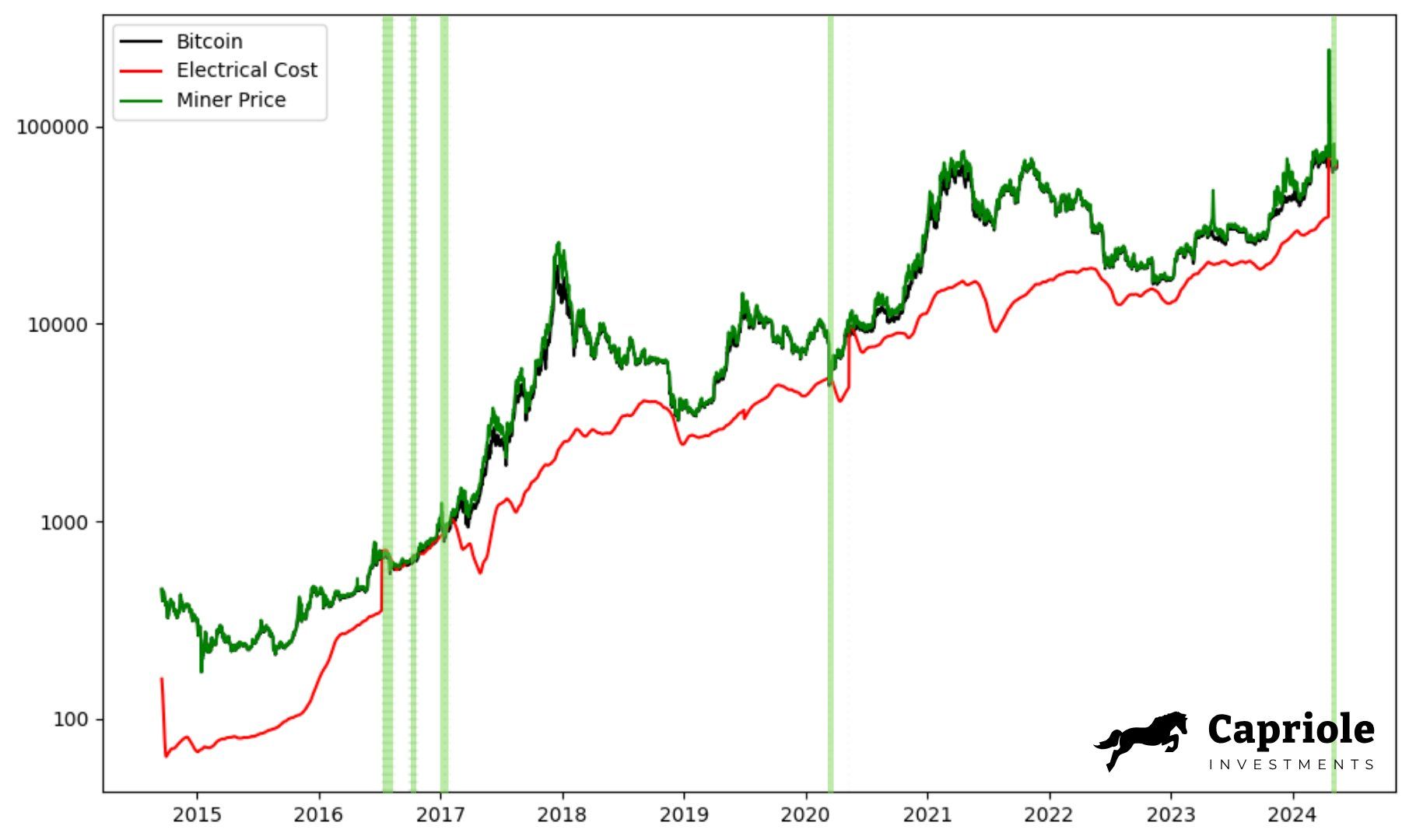 Capriole Investment đưa ra cách tính giá thợ đào Bitcoin, gọi là Bitcoin Miner Price như sau. Bitcoin Miner Price sẽ bằng giá Bitcoin cộng cho phí giao dịch nhận được hằng ngày, rồi chia cho số BTC khai thác được hằng ngày. Chi phí điện đào Bitcoin được tính từ nghiên cứu của Đại học Cambridge theo dõi chi phí từ 2014 đến nay.