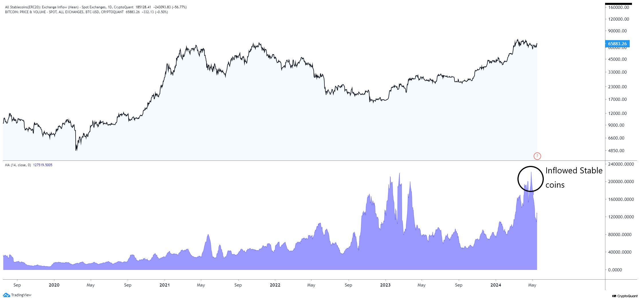 Dữ liệu đầu tiên ủng hộ cho kịch bản tăng giá, đó là lượng stablecoin lên sàn có dấu hiệu tăng đột biến trong những tuần cuối tháng 4 và đầu tháng 5. Bất kể, giai đoạn này giá BTC sụt giảm về dưới 57,000 USD.