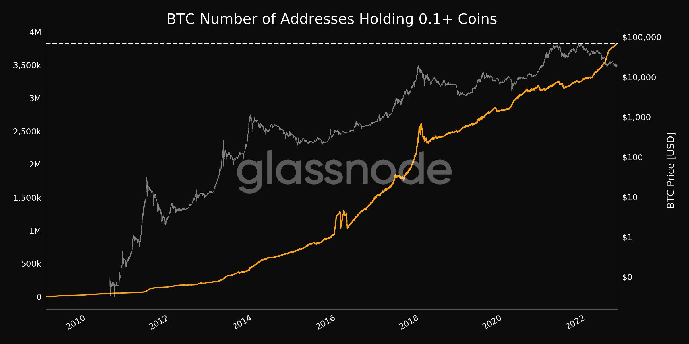 Lượng địa chỉ ví BTC có số dư từ 0.1 vừa lập tiếp ATH mới vào hôm nay.