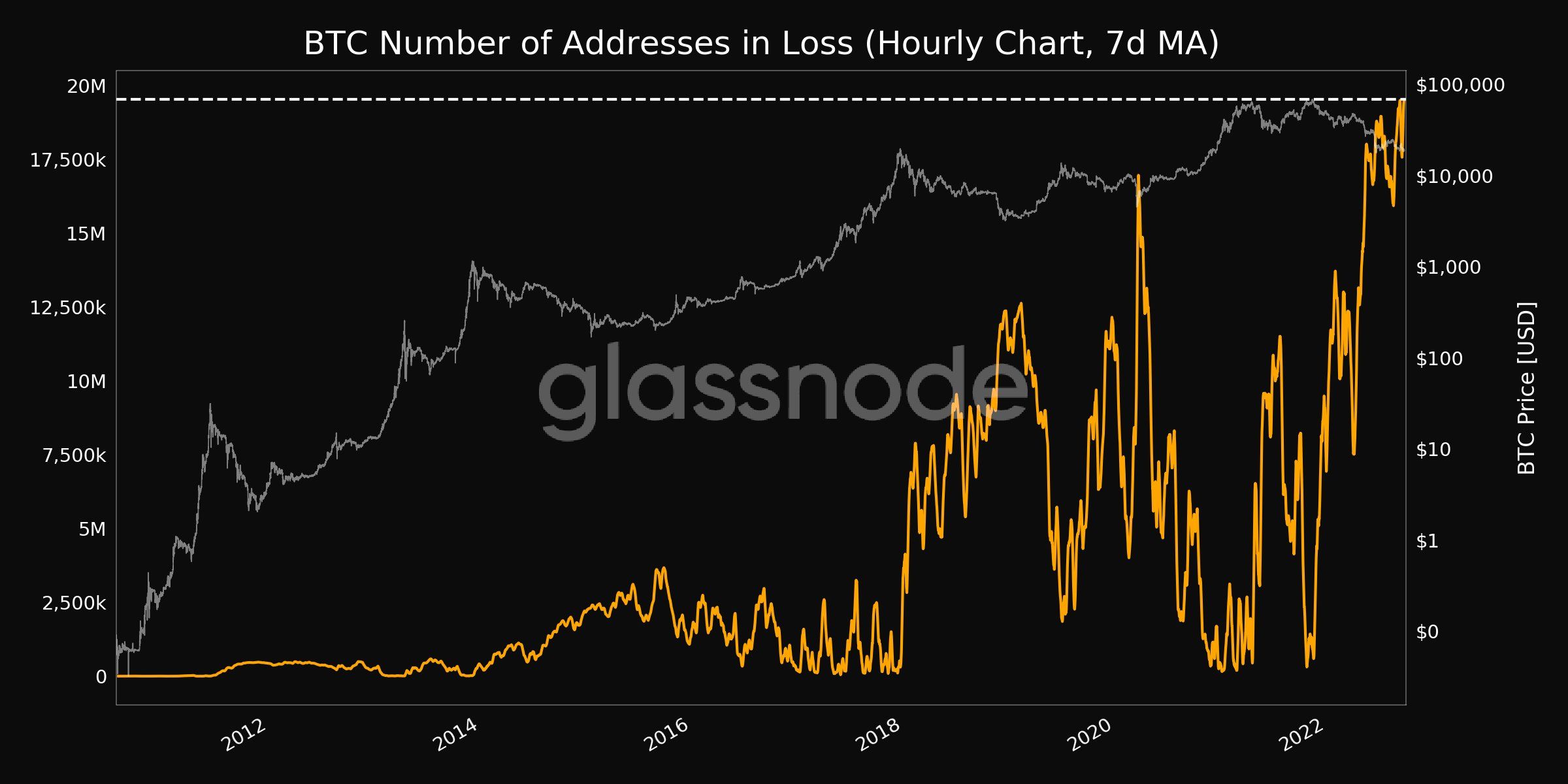 - Gần 20 triệu địa chỉ ví đang lỗ (tính theo mức trung bình 7 ngày), nghĩa là còn cao hơn cả giai đoạn thiên nga đen hồi tháng 3/2020. Từ dữ liệu này có thể khẳng định rằng chưa có downtrend nào gây thiệt hại nghiêm trọng như downtrend 2022.