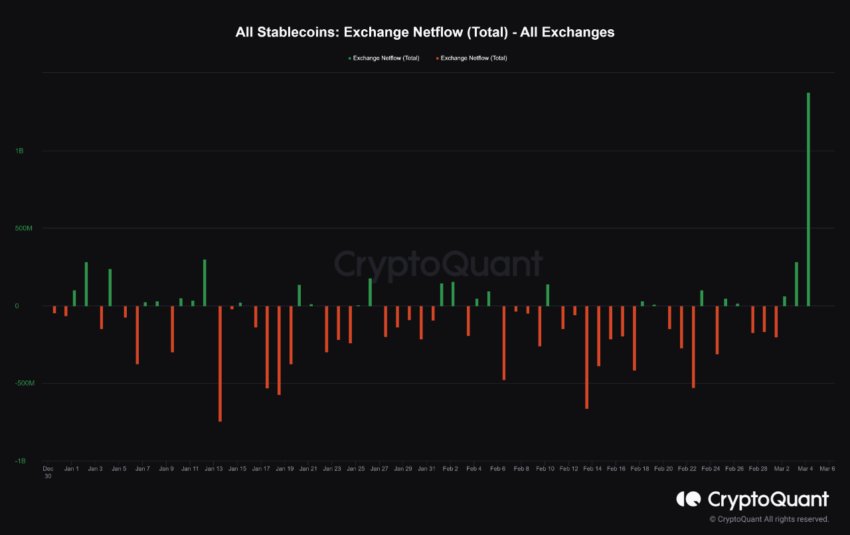 Vào ngày 06/3, công ty phân tích CryptoQuant đã báo cáo sự gia tăng của lượng stablecoin gửi lên các sàn giao dịch. Ngoài ra, công ty cũng báo cáo “mức cao nhất trong năm” khi số dư stablecoin trên sàn tăng mạnh vào ngày 05/3.