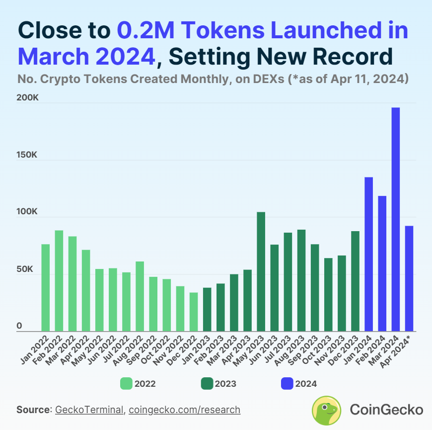 SponsoredRiêng tháng 3 năm nay, số token tạo mới trong tháng lập mức cao kỷ lục với gần 200,000. Giai đoạn Q1/2024 đến nay cũng là giai đoạn làn sóng meme khuấy động thị trường. Rất nhiều meme trên các chain được tạo mới, bất kể nhiều cảnh báo về rug-bull, nhưng nhà đầu tư nhỏ lẻ vẫn lao vào meme với kỳ vọng lợi nhuận lớn. Các công cụ tạo meme cũng được chú ý phát triển, đến mức một người dùng non-tech cũng có thể tự tạo meme trong thời gian rất ngắn.