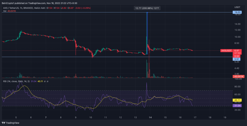 Chỉ trong vài phút, khối lượng giao dịch AXS tăng vọt. Một số nhà đầu tư đã chốt lời và ngay lập tức rút khỏi thị trường. Song song với giá AXS tăng đột biến, chỉ số RSI đã bị đẩy lên cao và sau đó cũng thoái lui nhanh chóng. Vào thời điểm BeInCrypto viết bài, chỉ báo RSI của AXS đang dao động gần vùng quá bán gây ra áp lực giảm trên thị trường. Giá Axie Infinity được giao dịch ở mức 6.96 USD, giảm 5% trong ngày.