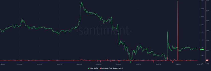 Số lượng AXS token trên các sàn giao dịch cho thấy dòng tiền vào tăng đột biến vào ngày 13/11, ngay sau khi giá được bơm. Đáng chú ý, một cá voi AXS đã bán gần 3 triệu mã thông báo Axie Infinity token và rời khỏi thị trường.
