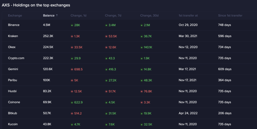 SponsoredDòng tiền vào được chứng thực bằng dữ liệu về lượng nắm giữ trên các sàn giao dịch hàng đầu. Nó cho thấy mức tăng 3.4 triệu AXS trên Binance trong tuần qua. Trong ngày qua, đã có thêm 28,000 AXS khác được gửi lên Binance.