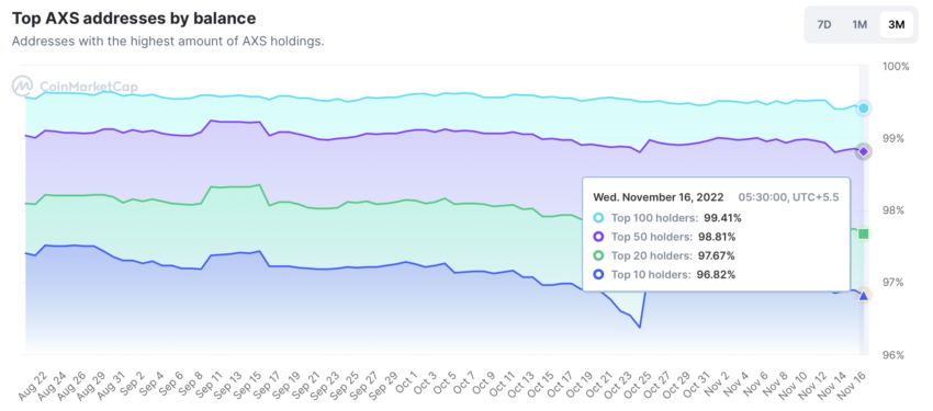 Số liệu thống kê cho thấy, 100 cá voi AXS hàng đầu nắm giữ 99.41% lượng token. Nhóm còn lại chỉ nắm giữ 0.59%. Và chính điều này đã gây ra rắc rối cho giá AXS trong thời gian gần đây.
