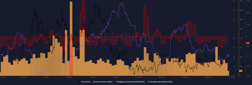 Mặc dù các chỉ số kỹ thuật ngắn hạn của SOL có vẻ khả quan, nhưng dữ liệu trực tuyến từ Santiment cho thấy rằng mức độ quan tâm đối với Solana trên các mạng xã hội đã giảm dần.