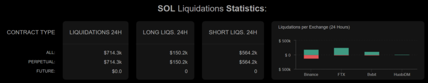 Ngoài ra, thống kê về khối lương thanh lý của SOL cho thấy các vị thế “short” bị thanh lý nhiều hơn đáng kể so với các vị thế “Long”. Cụ thể, khối lượng các vị thế “short” bị thanh lý lên tới 564,200 USD, trong khi con số này ở “Long” là 150,200 USD. Đây là tín hiệu tăng giá tổng thể cho thị trường.