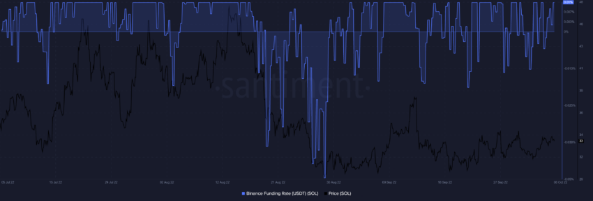 Bất chấp động lực chung chậm chạp, funding rate của SOL trên Binance đã chuyển sang mức tích cực (dương). Điều này thể hiện tâm lý lạc quan trên thị trường tương lai đối với Altcoin này.