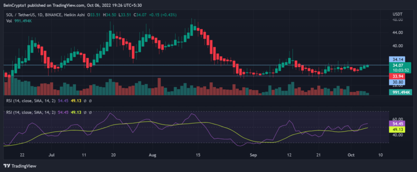 Trong khi dữ liệu thị trường hợp đồng tương lai cho thấy có vẻ đã đến thời điểm chín muồi để giá SOL tăng, các chỉ báo kỹ thuật lại cho thấy những dấu hiệu hoàn toàn khác cho SOL. Tại thời điểm viết bài, Solana là tài sản xếp thứ 9 theo vốn hóa thị trường. Giá SOL đã giao dịch gần với mức kháng cự 34 USD, dao động ở mức 33.91 USD.