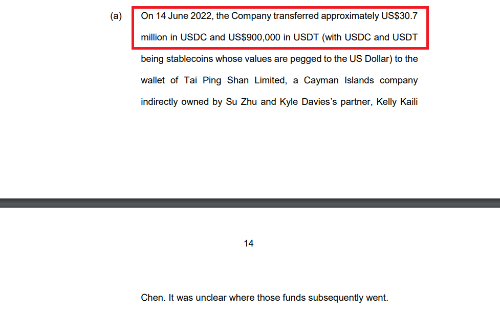 Theo đó, 3AC dường như đã chuyển 31.6 triệu USD (gồm 30.7 triệu USDT và 900,000 USDC) vào ví của công ty Tai Ping Shan. Tài liệu cũng nêu rõ Tai Ping Shan là một công ty được thành lập tại “thiên đường thuế” Cayman. Đáng chú ý hơn cả, công ty này thuộc sở hữu của Su Zhu và một thành viên của Kyle Davies có tên là Kelly Kaili. Điều này đã dấy lên nhiều nghi ngờ xoay quanh tính minh bạch trong hoạt động tài chính của 3AC và những người sáng lập.