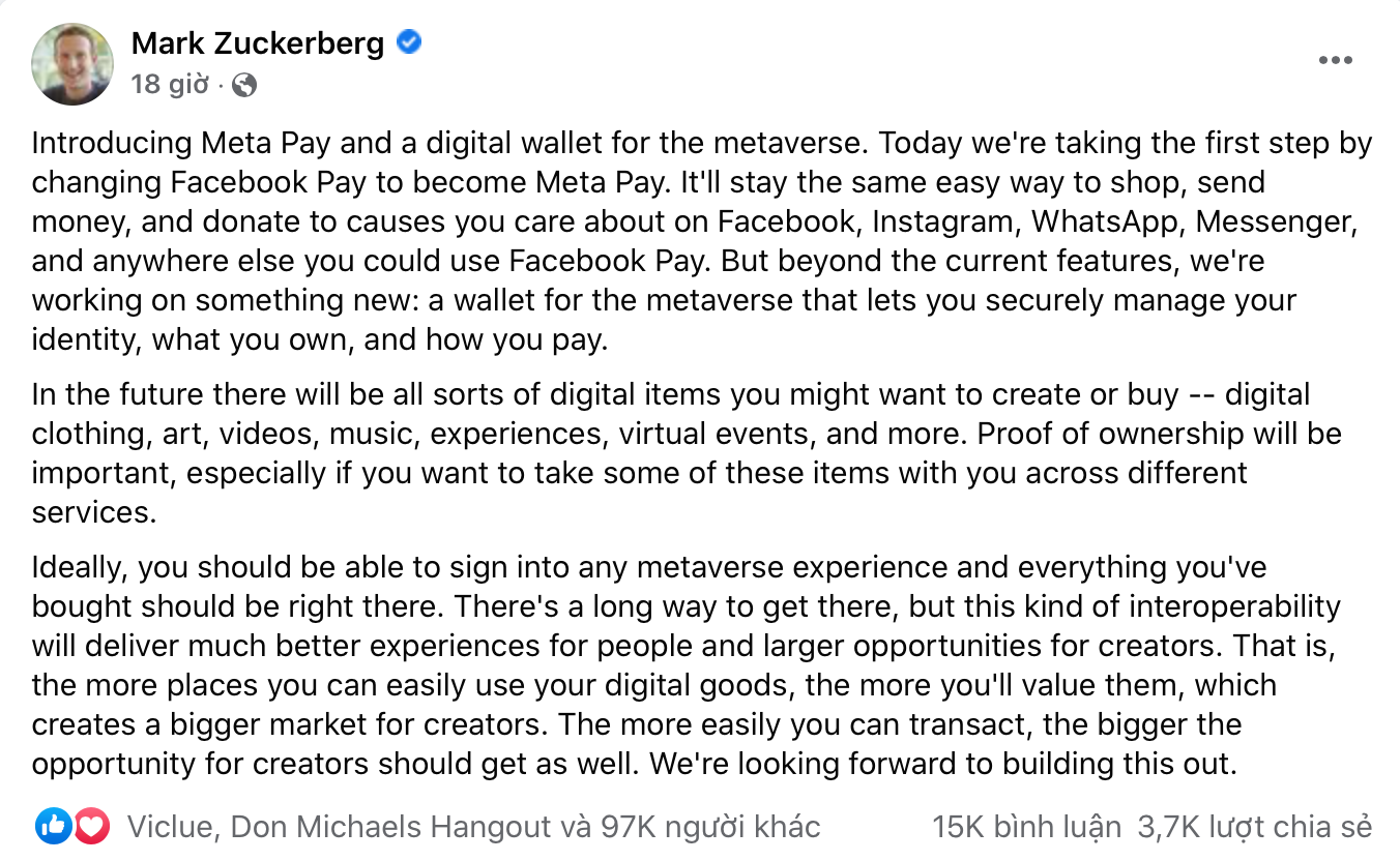CEO của Meta, Mark Zuckerberg, đã xuất bản một bài đăng trên Facebook, nói rằng Meta Pay sẽ thay thế Facebook Pay và có thêm các tính năng mới.