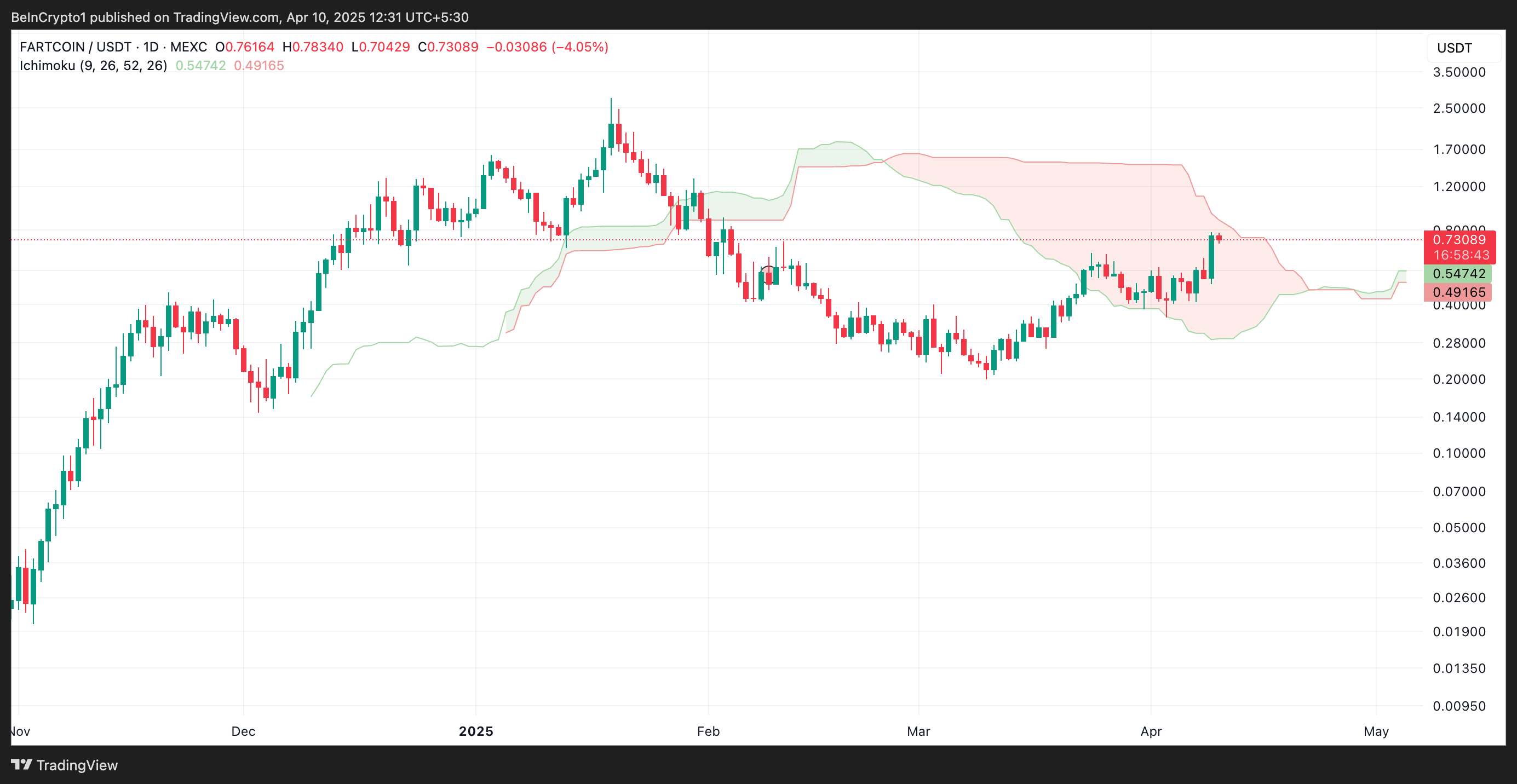 Khi giá của một tài sản vượt qua Leading Span A và có khả năng vượt qua Leading Span B, điều này báo hiệu một xu hướng tăng mạnh mẽ. Điều này gợi ý về khả năng tăng giá tiếp theo khi FARTCOIN di chuyển vào vị trí thị trường thuận lợi hơn.