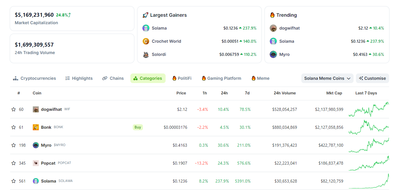 Để đạt được mức vốn hóa như hiện tại, tất cả các meme coin hệ Solana đều ghi nhận mức tăng trưởng từ vài chục đến vài trăm phần trăm trong ngày qua. Khi xét đến khung thời gian tuần, cá biệt một số dự án có mức tăng trưởng đến hơn 5,300%, ví dụ như Solama.