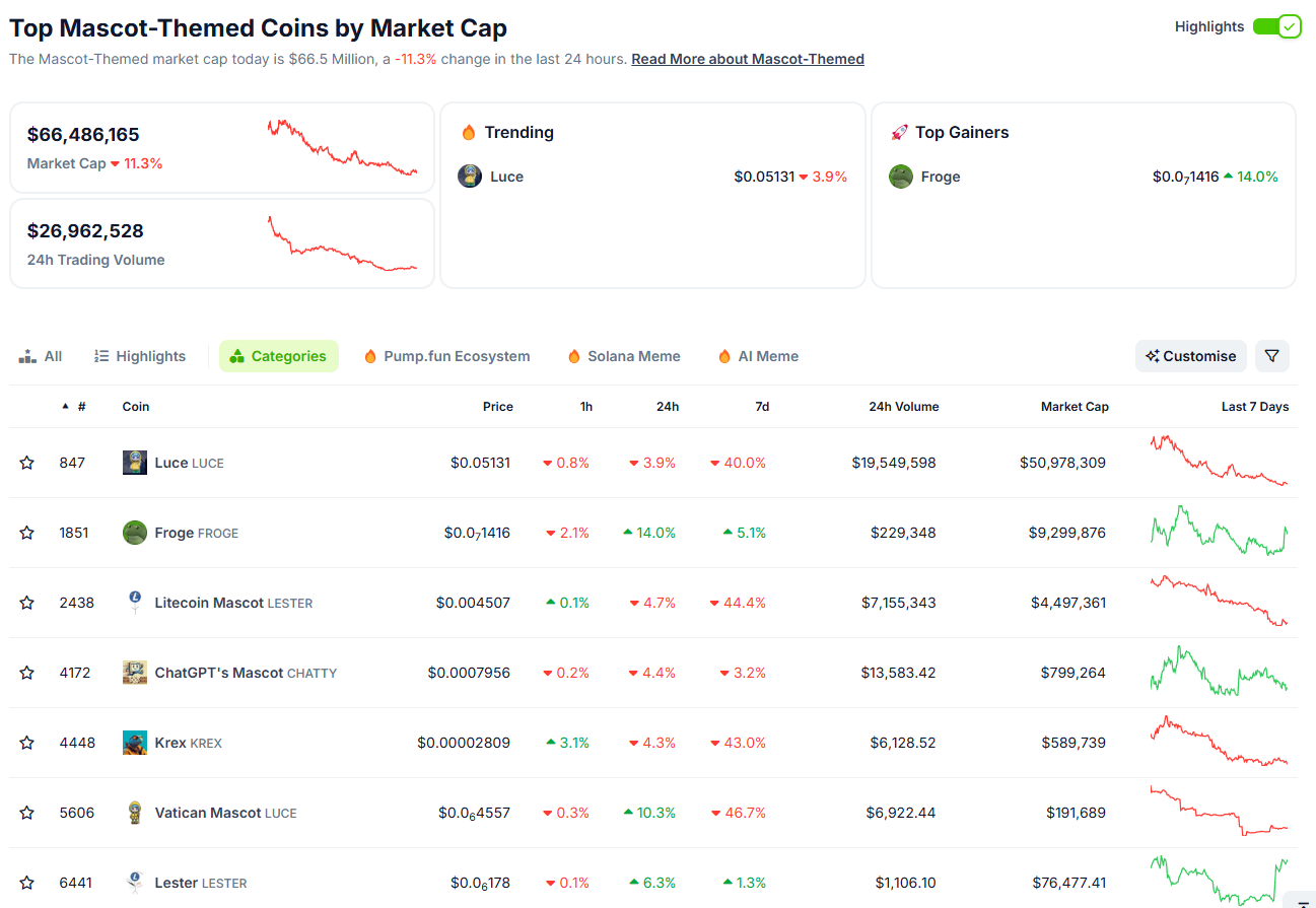 Dữ liệu từ CoinGecko cho thấy, vốn hóa của thị trường meme coin chủ đề Mascot đang ở quanh mức 66.5 triệu USD sau khi tiếp tục giảm thêm 11% trong ngày hôm nay. Khối lượng giao dịch trong ngày cũng chỉ đạt gần 27 triệu USD.
