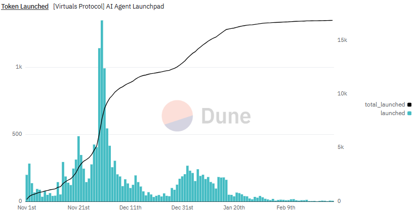Dữ liệu gần đây từ Dune cho thấy chỉ có 6-7 token AI agent được tạo ra hàng ngày trên Virtual, giảm 99.5% so với đỉnh điểm vào tháng 12 năm ngoái. Sự sụt giảm mạnh này phản ánh sự giảm nhiệt đối với token AI agent, mặc dù câu chuyện AI rộng lớn hơn vẫn là một chủ đề chi phối trên thị trường.