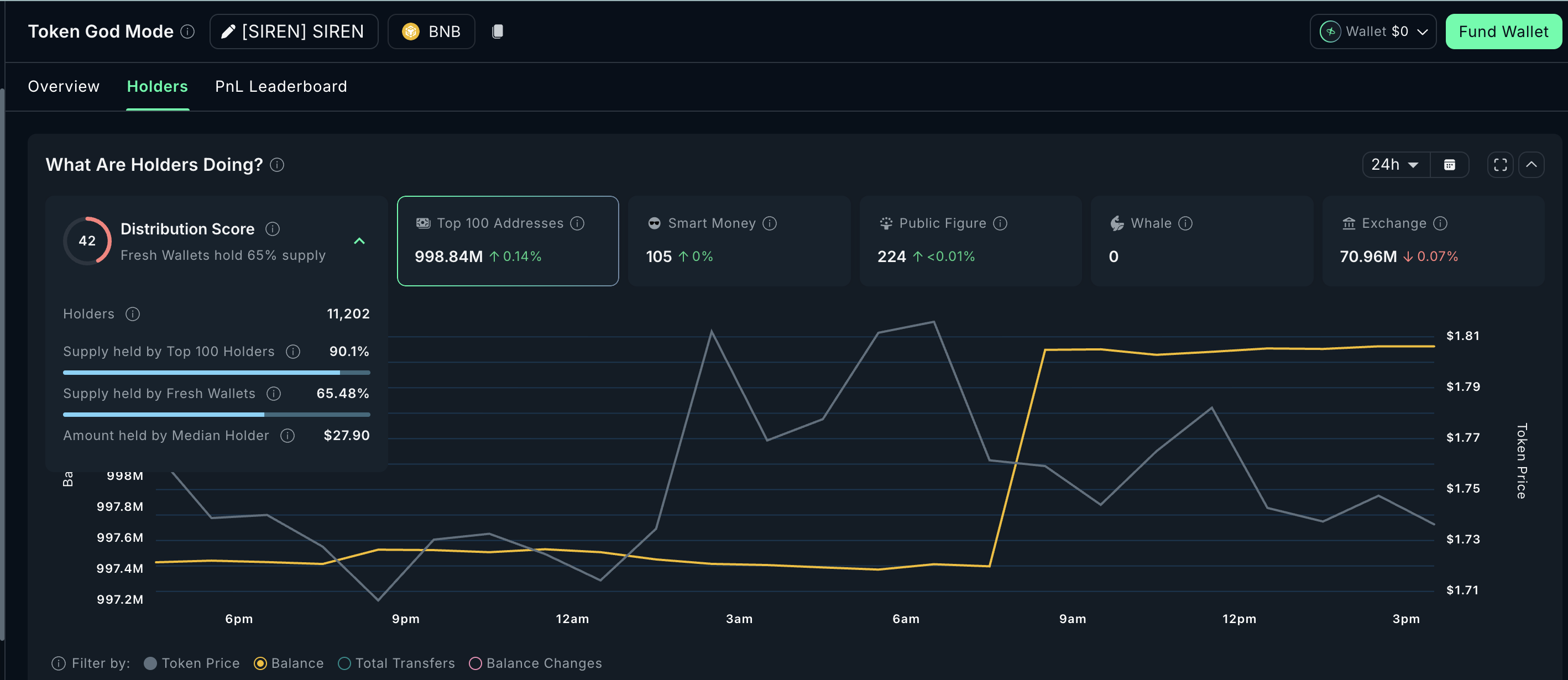 Sự yên lặng này càng đáng chú ý hơn khi kết hợp với việc các “cá voi” SIREN nắm giữ cực kỳ tập trung. Top 100 ví lớn nhất hiện đang kiểm soát 90.1% tổng cung. Trong 24 giờ qua, các ví lớn lẫn lượng coin sàn giao dịch gần như không có biến động rõ rệt.
