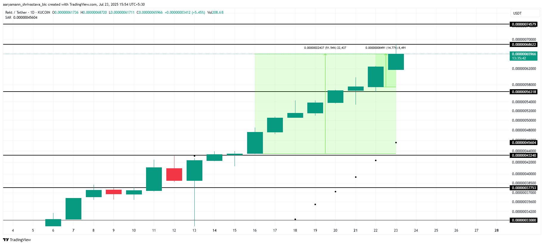Nếu REKT thành công vượt qua ngưỡng kháng cự 0.000000686 USD, nó có thể đẩy meme coin này tiến tới ngưỡng kháng cự tiếp theo tại 0.000000745 USD. Mức này có thể mang lại lợi nhuận đáng kể cho các nhà đầu tư, củng cố xu hướng tăng.