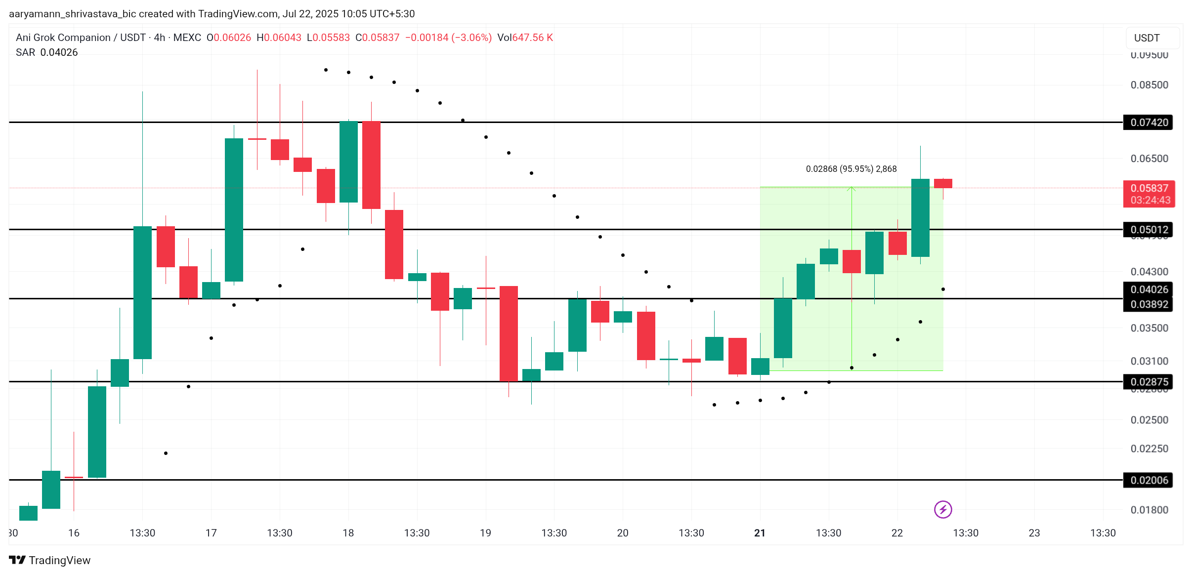 ANI đã nổi lên như một trong những meme coin hoạt động tốt nhất trong 24 giờ qua, tăng gần 96%. Hiện đang giao dịch ở mức 0.058 USD, meme coin này cho thấy động lực mạnh mẽ. Sự tăng nhanh này đặt ANI vào vị trí có thể có thêm lợi nhuận, khiến nó trở thành một trong những đồng tiền điện tử được theo dõi nhiều nhất trên thị trường.