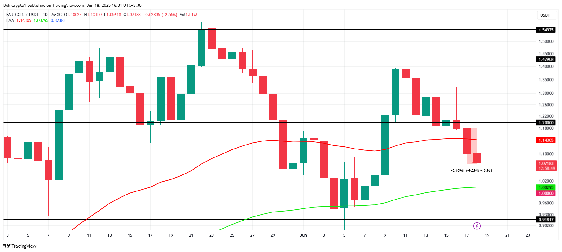 Mặc dù mất hỗ trợ EMA 50 ngày, FARTCOIN vẫn tìm thấy hỗ trợ từ EMA 100 ngày và 200 ngày. Những mức này có thể giúp altcoin đảo ngược các khoản lỗ gần đây. Nếu giá có thể lấy lại động lực, FARTCOIN có thể tăng trở lại lên 1.20 USD và cố gắng chuyển mức này thành hỗ trợ mới.